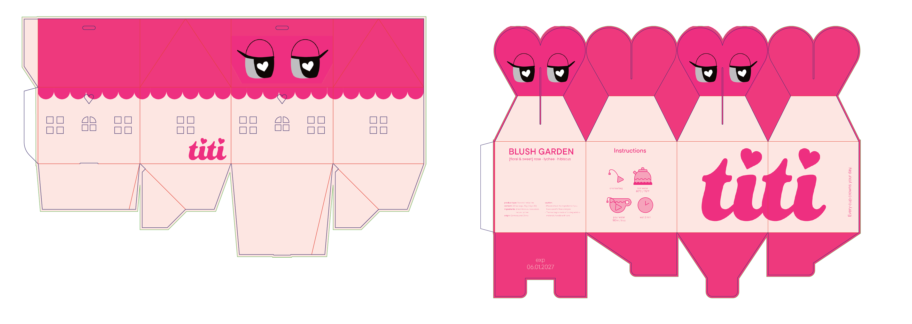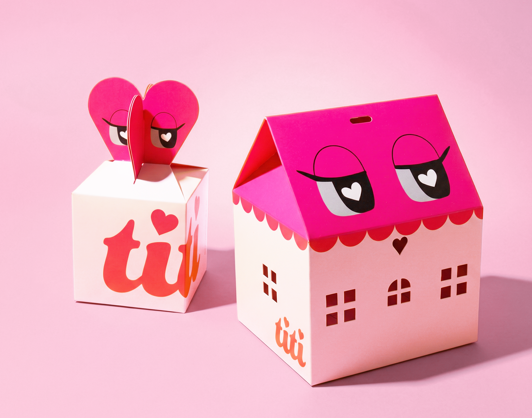 I used the heart outline and eyes of the mascots to craft the package design. Through the limited color palette, I have established cohesiveness across the designs. For the larger package, I was inspired by a doll's house and made use of the femininity and cuteness the toy inherits.